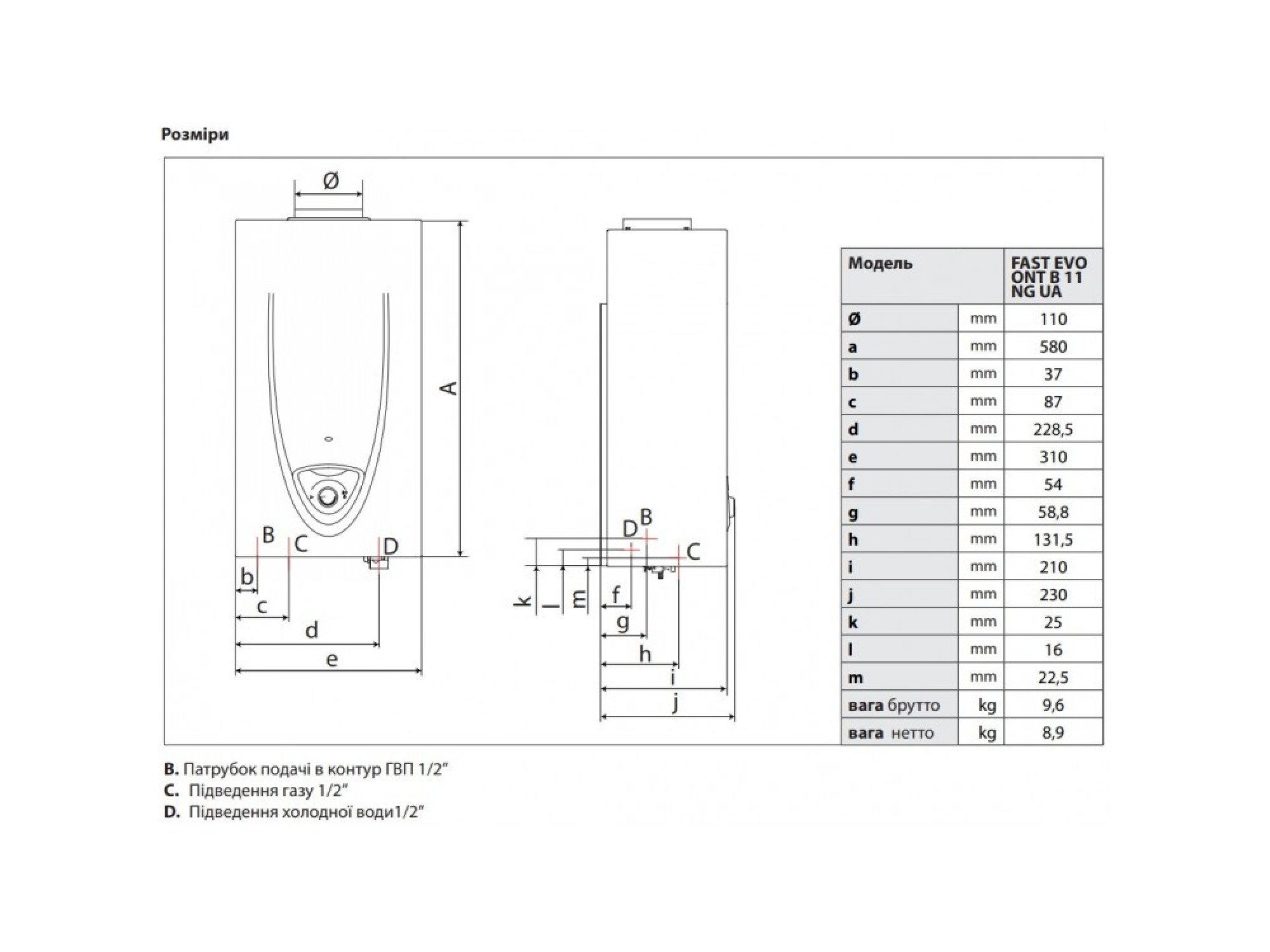- подвод: нижнее подключение воды и газа